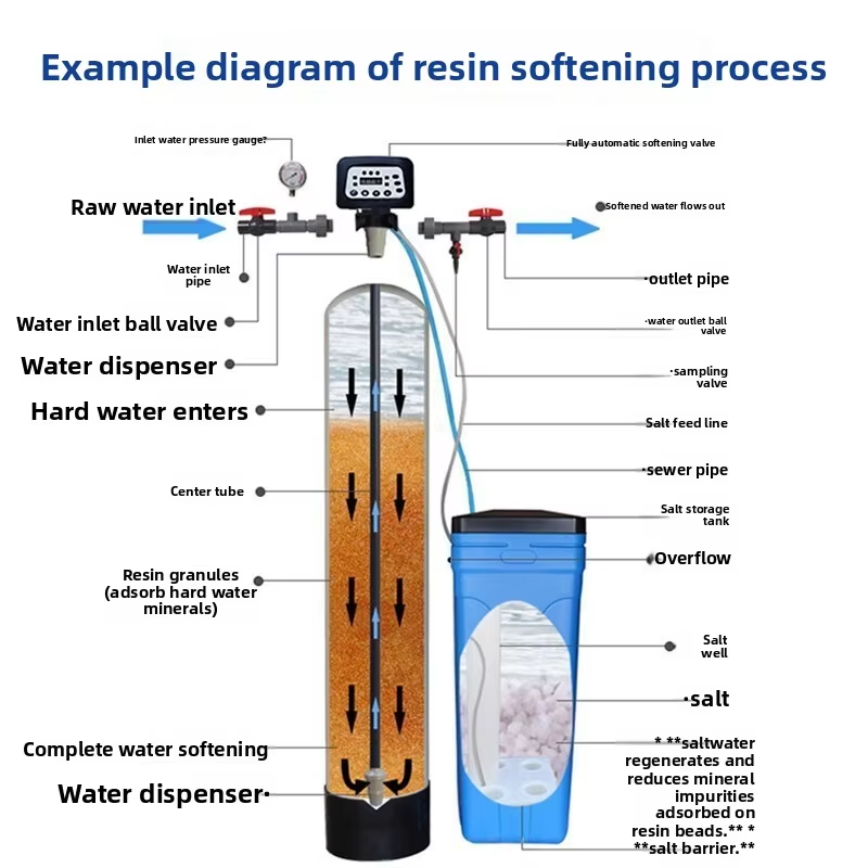 | Resin | The core consumable media, typically food-grade, strong acid cation exchange resin. Its quality and volume determine soft water output capacity and efficiency. |